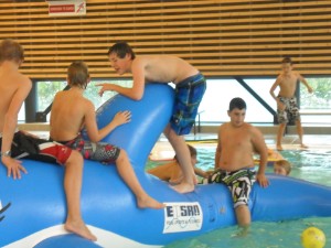 Vervolgens een lunch in de kantine van de sporthal en daarna het zwembad in. Een heerlijke warme zwembad met een grote plastic walvis in het midden. De jongens vermaakten zich met veel vreugde en plezier 2 1/2 uur lang zwemplezier. Er werd gepiept toen iedereen uit het bad moest komen.